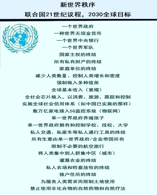 由联合国制定并由178个国家政府签署的《2030年议程》行动规划。它的目标是人类的人口减少,因为“我们的人口太多。”它被“精英们”宣传为“拯救地球”的方式,并被世界各国政府执行。