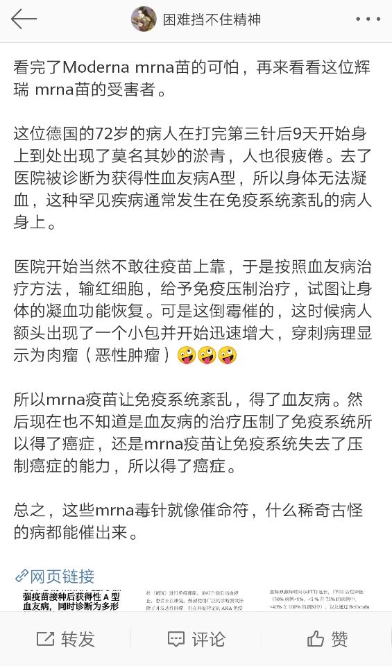 “三针后患白血病 重型再障贫血” “72岁打完三针疫苗后患血友病 无法凝血 患癌”