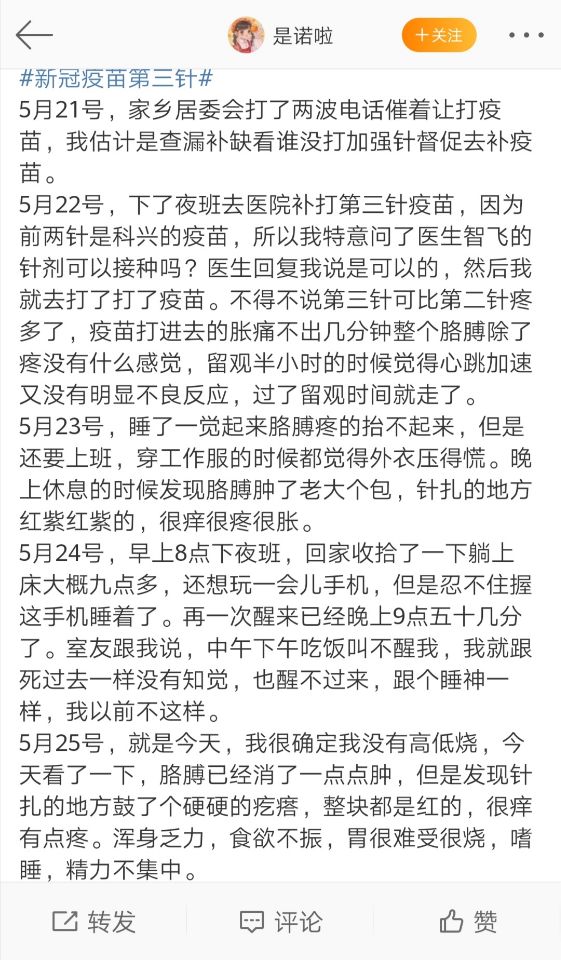 “疫苗三天后持续肌无力 虚弱 鼻炎 咳嗽” “疫苗后低烧 出现结节”