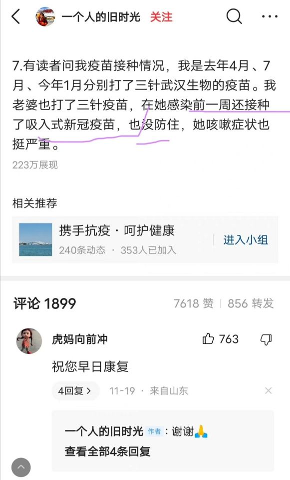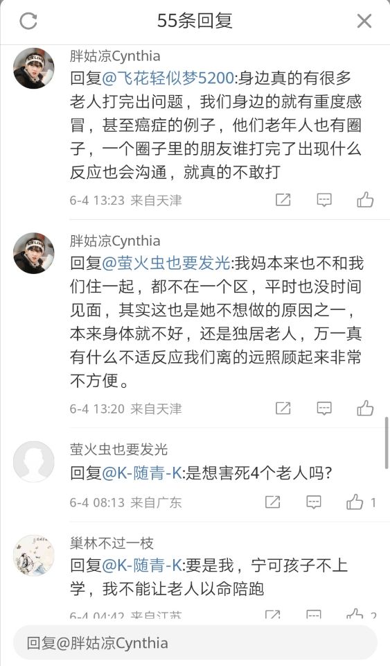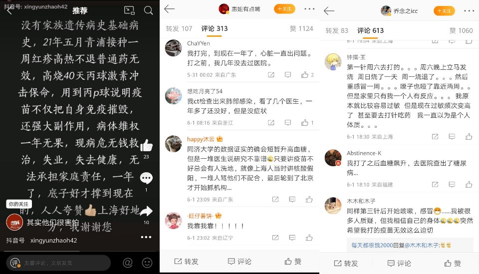『我现在还能想起那个被打了疫苗的老人,出现副作用,到处奔走呼吁求生,却失望到失去生机的眼睛……最后还是死亡了…我忘不了他被踢皮球后渐渐垂下头的脸,忘不了他最后还是变成了黄土。那些打过苗的发现副作用,本来就很苦了……再不断被删、被封号,声音不被听见……』——阿托