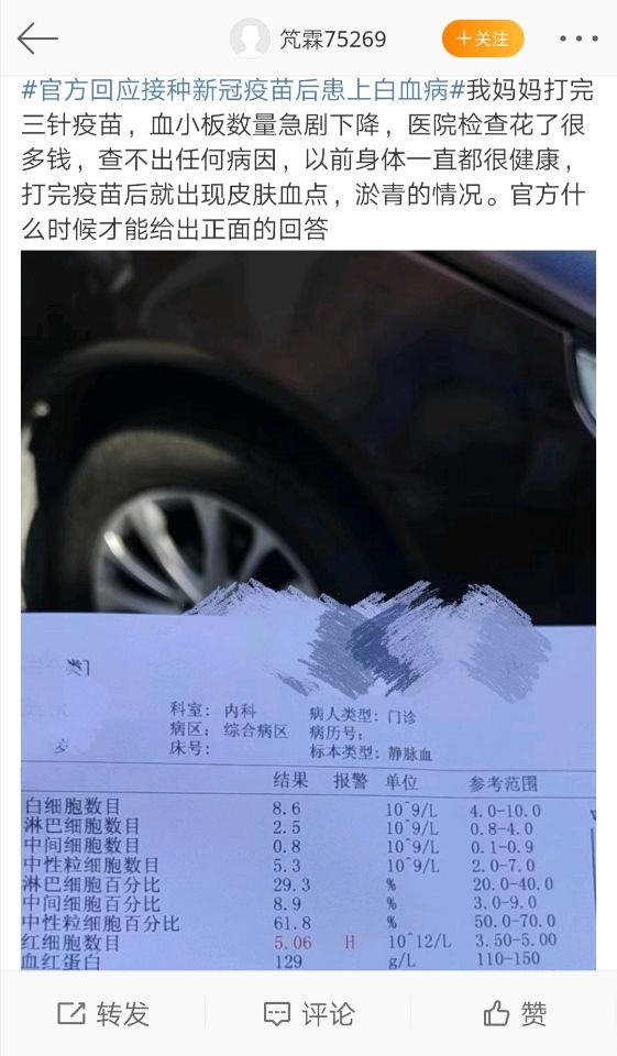 “疫苗2个月查出急性白血病 脑出血 肩膀持续疼痛” “疫苗后多人出现急性白血病 血小板骤降”