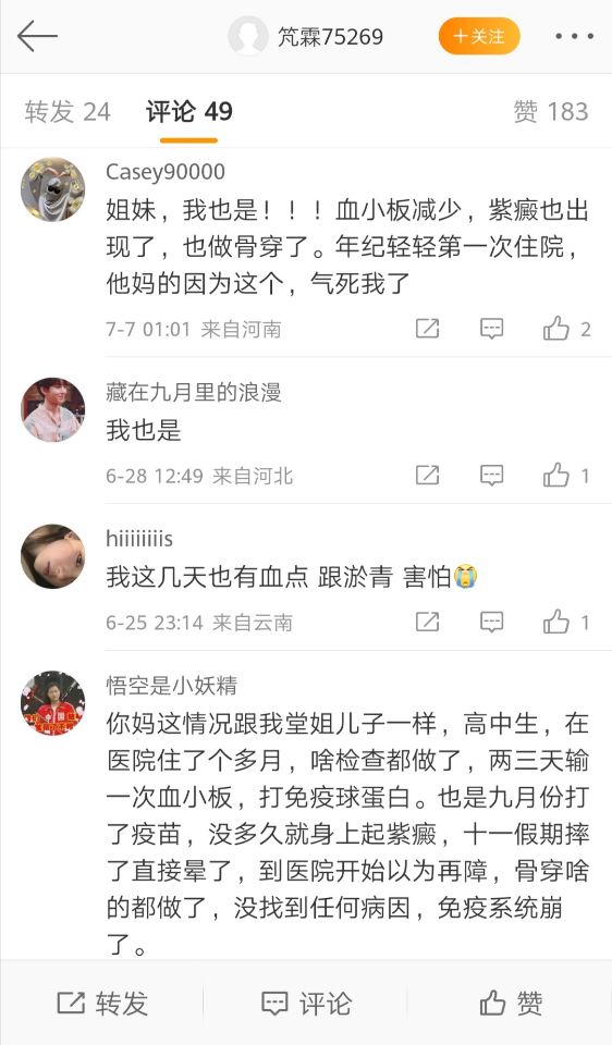 “三针疫苗后患急性髓系白血病M4” “疫苗后血小板减少 紫癜 免疫系统崩溃”